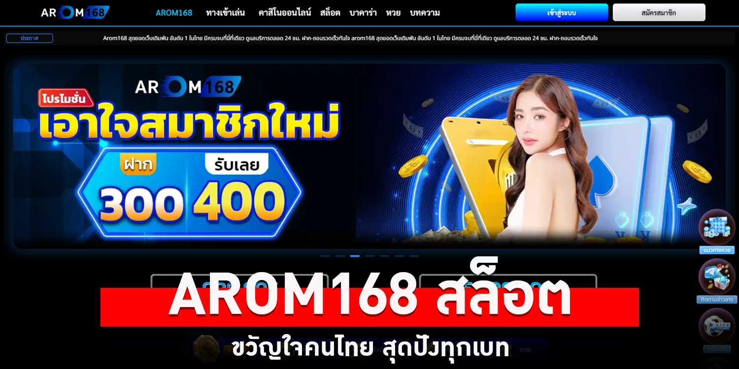 ก็พร้อมเข้าสู่โลกแห่งความบันเทิงที่เต็มไปด้วยเกมสล็อตมากมายจากค่ายดังระดับโลก เช่น PG Slot, Pragmatic Play, Joker Gaming และอีกนับร้อยเกมที่การันตีคุณภาพและความมันส์ เมื่อสมัครเสร็จ คุณยังจะได้รับสิทธิพิเศษมากมาย ทั้งโบนัสแรกเข้า โปรโมชั่นฝากเงินรายวัน และรางวัลจากกิจกรรมสุดพิเศษที่ arom168 จัดขึ้นเพื่อสมาชิกโดยเฉพาะ ที่สำคัญระบบฝาก-ถอนของเว็บนี้เป็นแบบอัตโนมัติ ทำรายการได้ตลอด 24 ชั่วโมง ไม่มีขั้นต่ำ ไม่ต้องรอนาน เพียงไม่กี่วินาที เงินก็เข้าสู่บัญชีของคุณทันที ความคุ้มค่าของ arom168 ยังไม่หยุดอยู่แค่โบนัสและโปรโมชั่น แต่ยังรวมถึงการบริการระดับมืออาชีพที่พร้อมช่วยเหลือคุณทุกเวลา ทีมงานแอดมินให้บริการตลอด 24 ชั่วโมง ไม่ว่าคุณจะมีคำถาม หรือประสบปัญหา ก็สามารถติดต่อได้ทันที